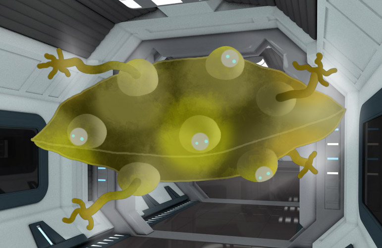 It attached to our airlock, opened it from the outside. We quickly put on space suits as it opened the inner door of the airlock and entered the ship, an alien creature! It is small, floating oval shaped creature covered in bumps, from which either tentacles or sensory organs emerge. It is yellowish-brown in color, and is surrounded by small floating devices which it can move telekinetically. One of the devices appeared to be a radio-like object through which it communicated with us.
